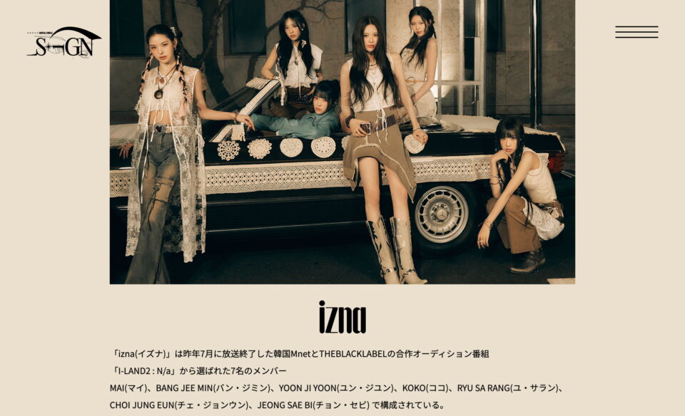 韓国出身のアイドルグループ、izna(イズナ)のシングル「SIGN」のスペシャルサイトのWEBデザインです。